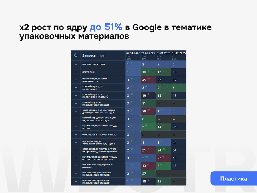 Смотрим, какие страницы и форматы уже работают в Google, как конкуренты закрывают интент и какие типы контента попадают в расширенные результаты, блоки вопросов и другие элементы выдачи. За счет этого понимаем, какие страницы, темы и форматы стоит усиливать в первую очередь.